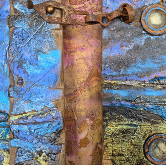 "As an artist I attempt to capture infinite horizons. My work has always been heavily layered to create light shift and shimmering, reflective color play on a variety of surfaces. I am intrigued by media that can be melded, fused, incised, unearthed. Ever changing luminescent light is reflected from a multitude of vantage points on each mixed media piece. Beyond accentuates this idea in its multiple layers of encaustic, cold wax, oil bar and oil paint with iridescent and interference pigments fused onto an antique Turkish window which I acquired on a trip there 20+ years ago. The clasped windows subtly reveal another interior layer, an encaustic work on copper that glows in the light, almost from within. Each abstracted layer collides and merges like the ever-changing stratified layers of the skies above, which is another recurring motif in my work. The potential to create an oxidized abstract landscape, a dark brooding monsoon, a sky ablaze at dawn or the peaceful calm within inspires and fuels my work."