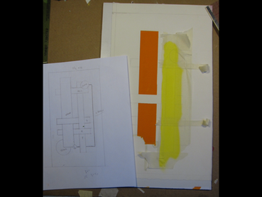 My exact scale cityscape series were first skylines and oblique scenes and now provide a vertical perspective where the patterns of reality become fully abstract. I use bold, saturated colors enhance the effect. The exhibited work, East Oakland Choreography, is a bird's-eye/satellite view of a neighborhood of the California city; the lines and hues create a portrait of the urban spirit." Debra Jan Bibel